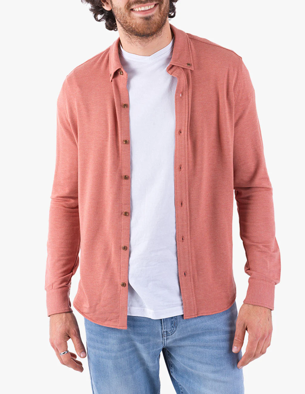 A true all-around performer. This red cashmere button down is stitched with fabrics that are so buttery soft it wouldn’t surprise us if you wore it for 48 straight hours. It comes in a smooth color and is thin enough to layer if that’s your kind of thing. It's built with work, play, and lounge in mind and brimming with stretch. Look good in any occasion.