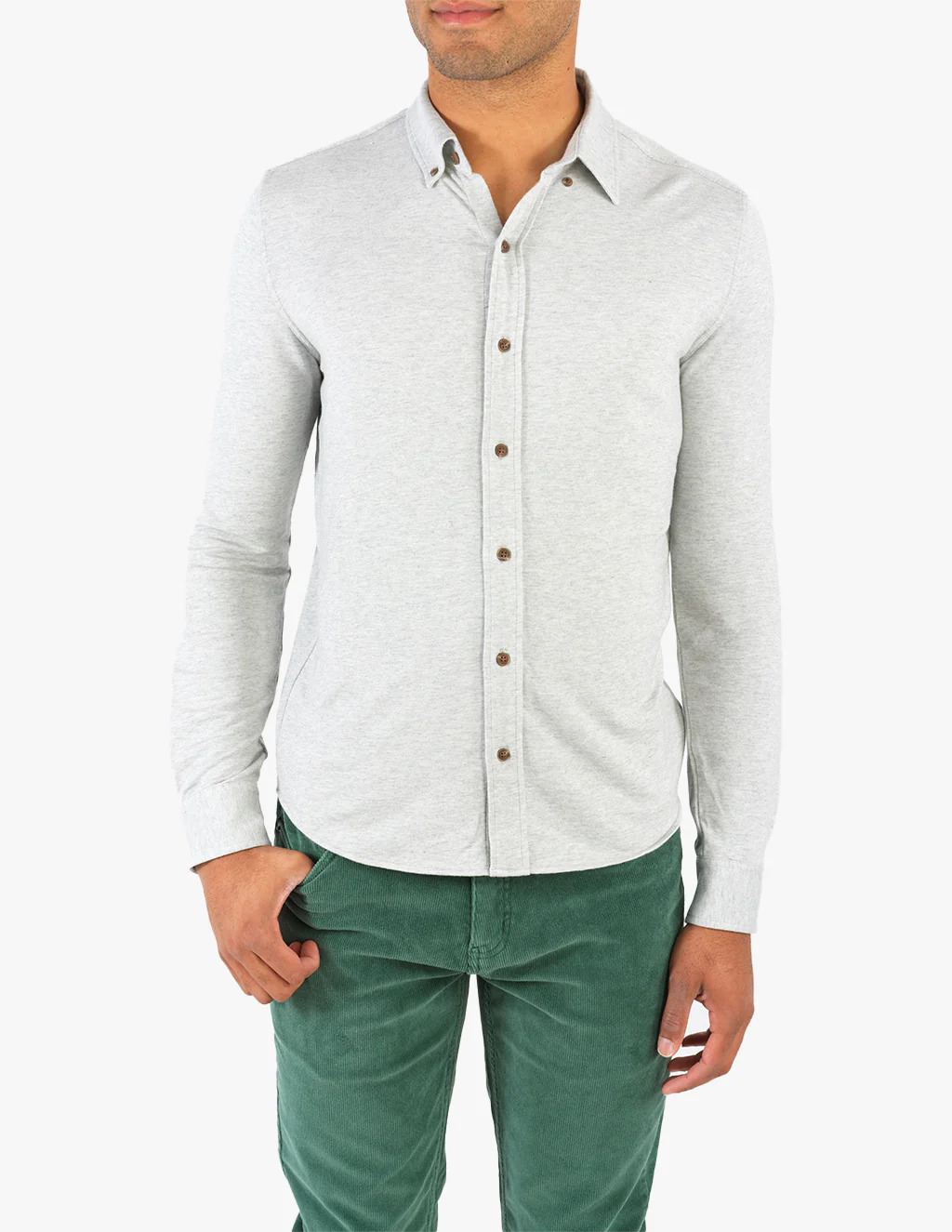 A true all-around performer. This grey cashmere button down is stitched with fabrics that are so buttery soft it wouldn’t surprise us if you wore it for 48 straight hours. It comes in a smooth color and is thin enough to layer if that’s your kind of thing. It's built with work, play, and lounge in mind and brimming with stretch. Look good in any occasion.